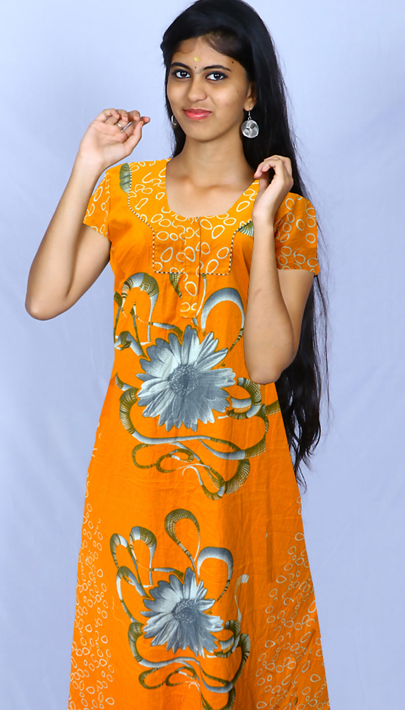 Cotton YELLOW Floral Nighties, The natural design of the gorgeous floral print give yourself the look. 100% Cotton Material Closure type - Front Zip Soft and comfortable Printed